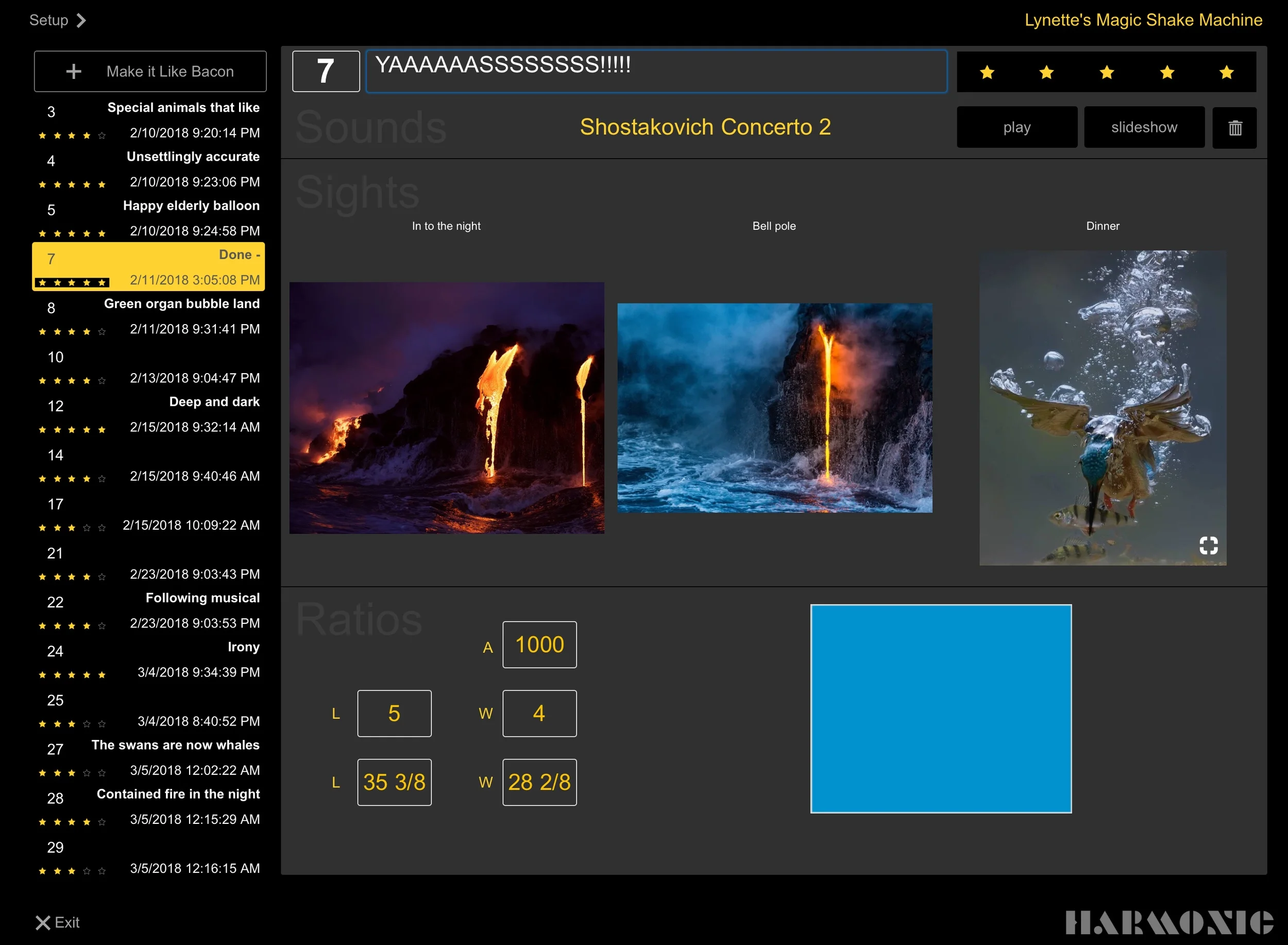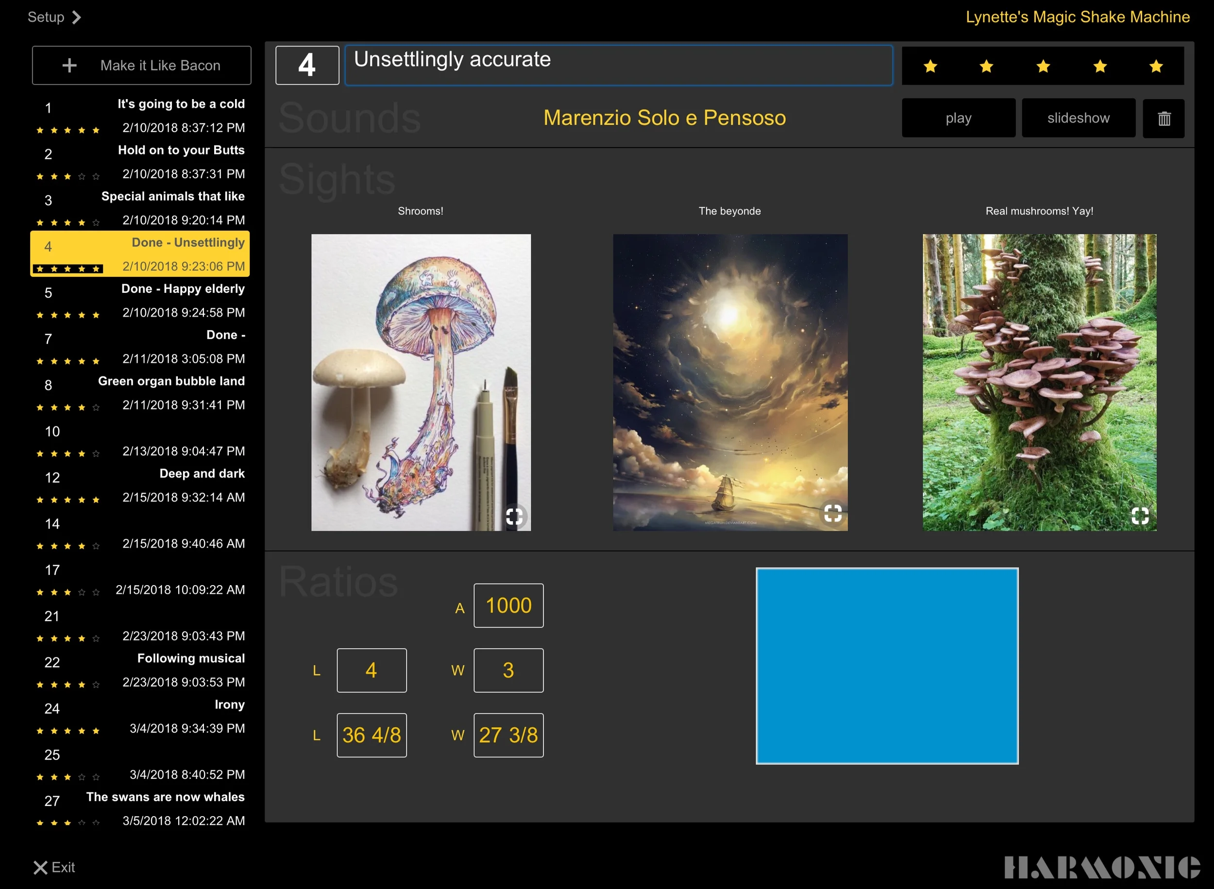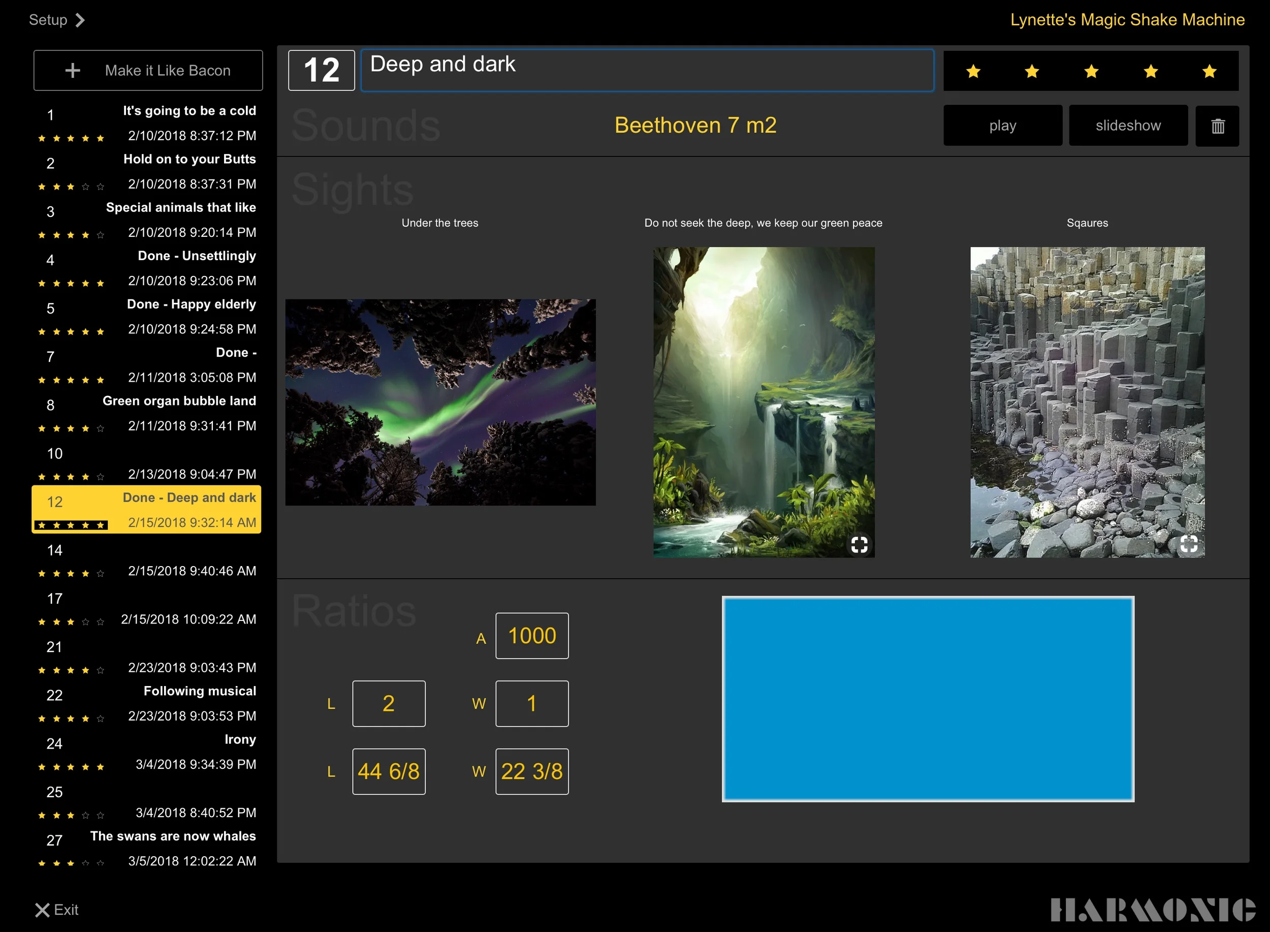 “Serendipity” is my endeavor to show music representationally, by capitalizing on my synesthetic input and an ingenues system known as the Magic Shake Machine. I collaborated to build this system that randomly selects three images, an aspect ration, and a piece of music. This Magic Shake Machine coupled with the color and texture sensation I receive from music is the spine of this series. Music has been the backbone of inspiration for my artistic career. I have loved and studied music since I was a small child, and it has predictably influenced my art, making itself the basis for my personal inspiration.
